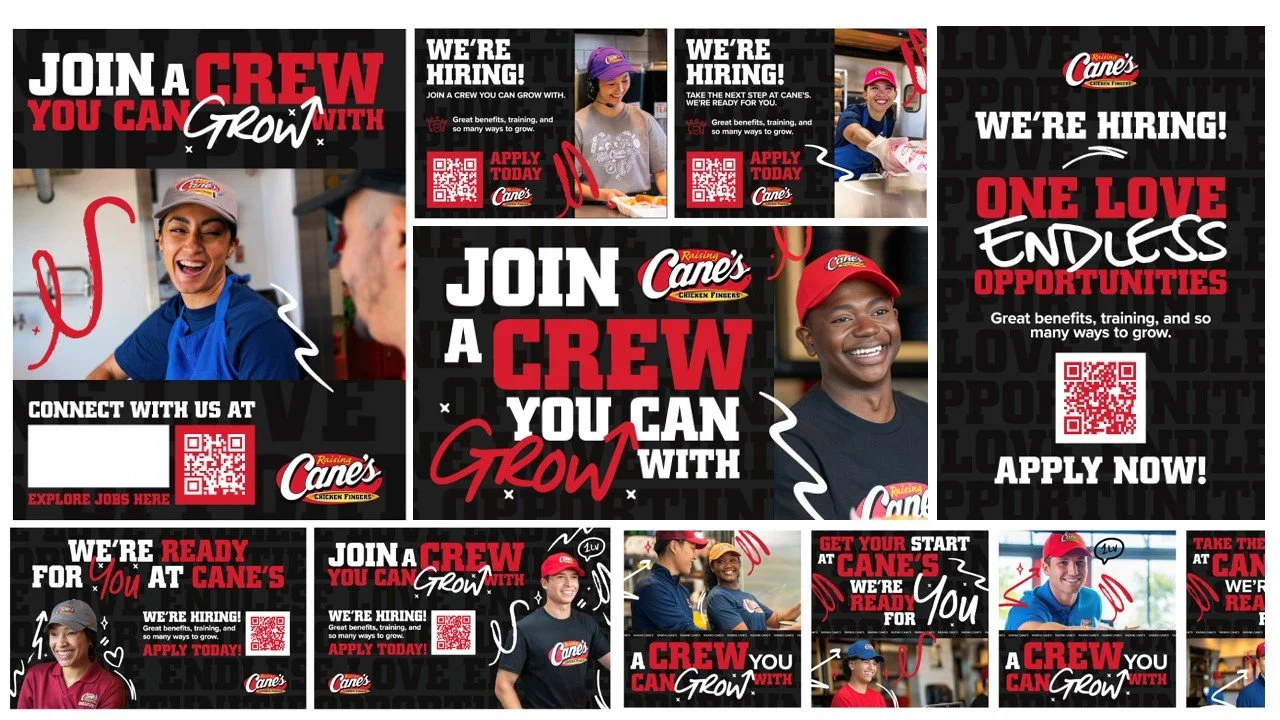 Raising Cane’s, a quick service restaurant founded in Louisiana famous for their chicken tenders and expanding across the US needed an EVP and recruitment ad campaign largely based on social digital and in store to meet their demand.